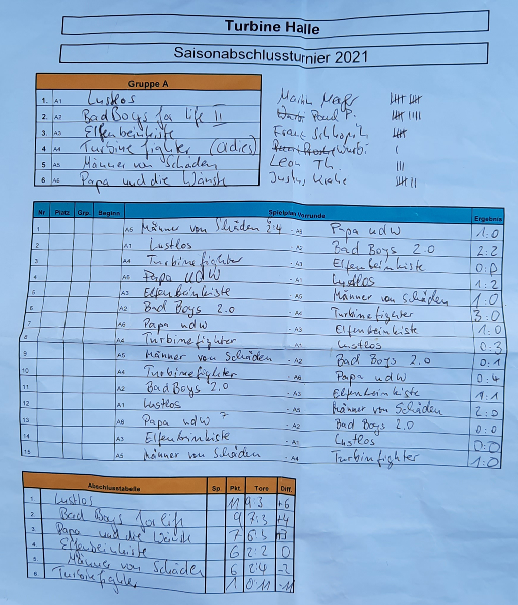 Sechs Teams fanden sich am Samstagnachmittag auf dem Felsen ein, um gemeinsam mit einem Vereinsturnier die Saison 2020/2021 ausklingen zu lassen. Begleitet von Musik und kühlen Getränken sahen die Beteiligten schnell, dass die Konkurrenz in diesem Jahr für Titelverteidiger "Bad boys for life" alias T1 stärker werden würde. Nach 15 Spielen stand fest, dass Team "Lustlos" - im Kern gespickt mit Spielern von T2 - ungeschlagen den Siegerchampus gewinnen würde. Nach den ebenfalls ungeschlagenen Bad Boys kamen "Papa und die Wänste" und "Team Elfenbeinkiste" ein. Beide Mannschaften versammelten aktive und ehemalige Akteure aller Männermannschaften. Im letzten Spiel hatten die im Durchschnitt etwa 20 Jahre älteren "Turbinefighter" die Chance, durch einen Sieg gegen die "Männer von Schäden" alias T3 noch auf Platz 5 zu springen. Doch im Gegensatz zum Vorjahr gelang dieser Coup nicht.