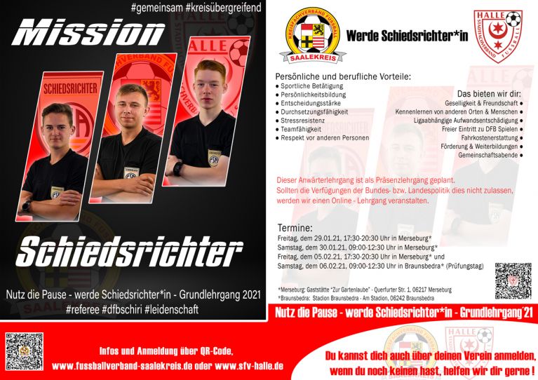 Der Stadtfußballverband bietet gemeinsam mit dem KFV Saalekreis Ende Januar/ Anfang Februar 2021 einen neuen Grundlehrgang für Schiedsrichter an. Auch unser Verein sucht junge und ältere Fußballer und Fußballinteressierte, die Lust und ernsthaftes Interesse haben, sich zum Schiedsrichter ausbilden zu lassen. Die Lehrgänge sind als Präsenzveranstaltung in Merseburg mit Prüfung in Braunsbedra geplant. Je nach aktueller Corona-Situation und gültiger Allgemeinverfügung des Landes Sachsen-Anhalt kann der Lehrgang auch als Online-Kurs stattfinden.