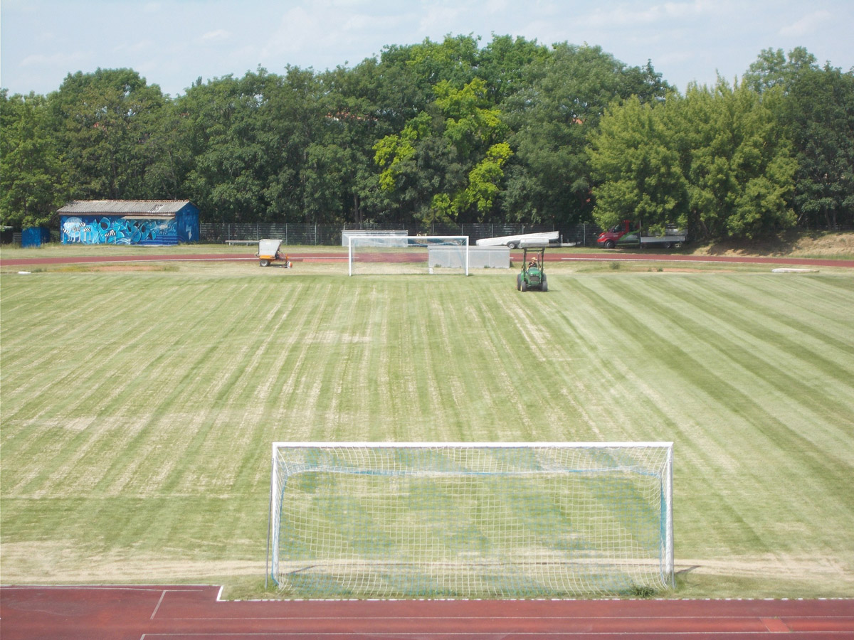 Die punktspielfreie Zeit lässt sich derzeit ganz prima nutzen, um die Sportanlage auf Vordermann zu bringen. Am heutigen Mittwoch erhielt der Rasenplatz eine Luft- und Sandkur. Die Firma ''Barthel Sportstättenservice' brachte 50 t Sand auf den Platz, aerifizierte das Grün und schleppte 7.000 m² ab. Die Unebenheiten, die vor allem aus dem Kunstrasenbaujahr stammen, sollten somit endlich weichen. Im Moment ähnelt der Rasenplatz noch ein wenig der Eurasischen Steppe. Aber mit viel Wasser und ein paar Tagen Geduld wird das Grün umso mehr sprießen. Wann auch immer die neue Saison starten wird: Unser Hauptplatz ist bereit!