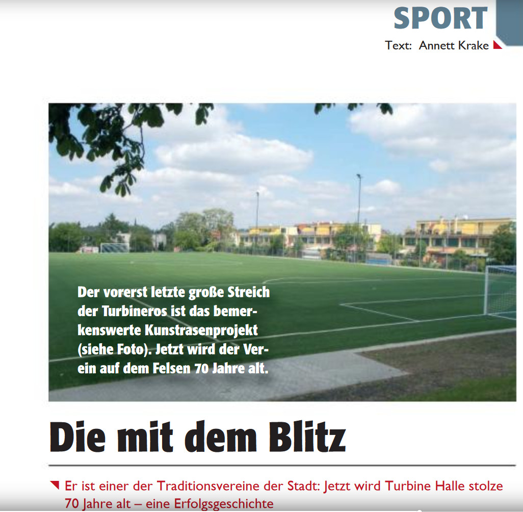 70 Jahre Turbine ist der aktuellen Septemberausgabe des FRIZZ-Magazins einen kleinen, aber sehr feinen Bericht wert. Annett Krake nimmt in ihrem Artikel vor allem die Fußballer und Leichtathleten unter die Lupe und beschreibt, wie dem Felsen und seinen Sportabteilungen in den letzten beiden Jahrzehnten neues Leben eingehaucht wurde. Einfach die neue FRIZZ besorgen und auf Seite 19 blättern!