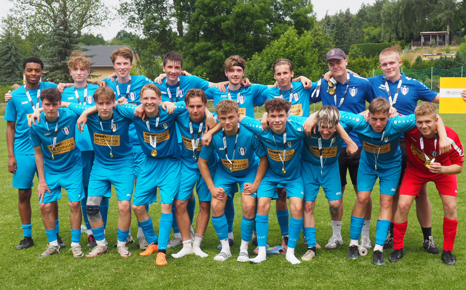 Für unsere A2-Junioren stand der Gewinn der Meisterschaft bereits seit einigen Wochen fest. Dennoch sollte auch hier nach dem letzten Spiel die Ehrung für die Meisterschaft auf dem Gutenberger Sportplatz durch den FSA nicht fehlen. Ungeschlagen belegt Turbine am Ende den 1.Platz. Zuvor musste man sich auf dem kleinen Spielfeld mit dem 1.SV Sennewitz messen. Die zweimalige Führung für Sennewitz konnten Jann Frerik Neumann (20.) und Lui Schneider (40.) ausgleichen, bevor Turbine durch zwei Treffer von Nick Waschkowitz (49., 50.) selbst auf 4:2 davonzog. Dennoch blieb es nach dem postwendenden Anschlusstreffer für die Gastgeber bis zum Schluss spannend. Erneut Jann Frerik Neumann stellte kurz vor Abpfiff den 5:3-Endstand her.