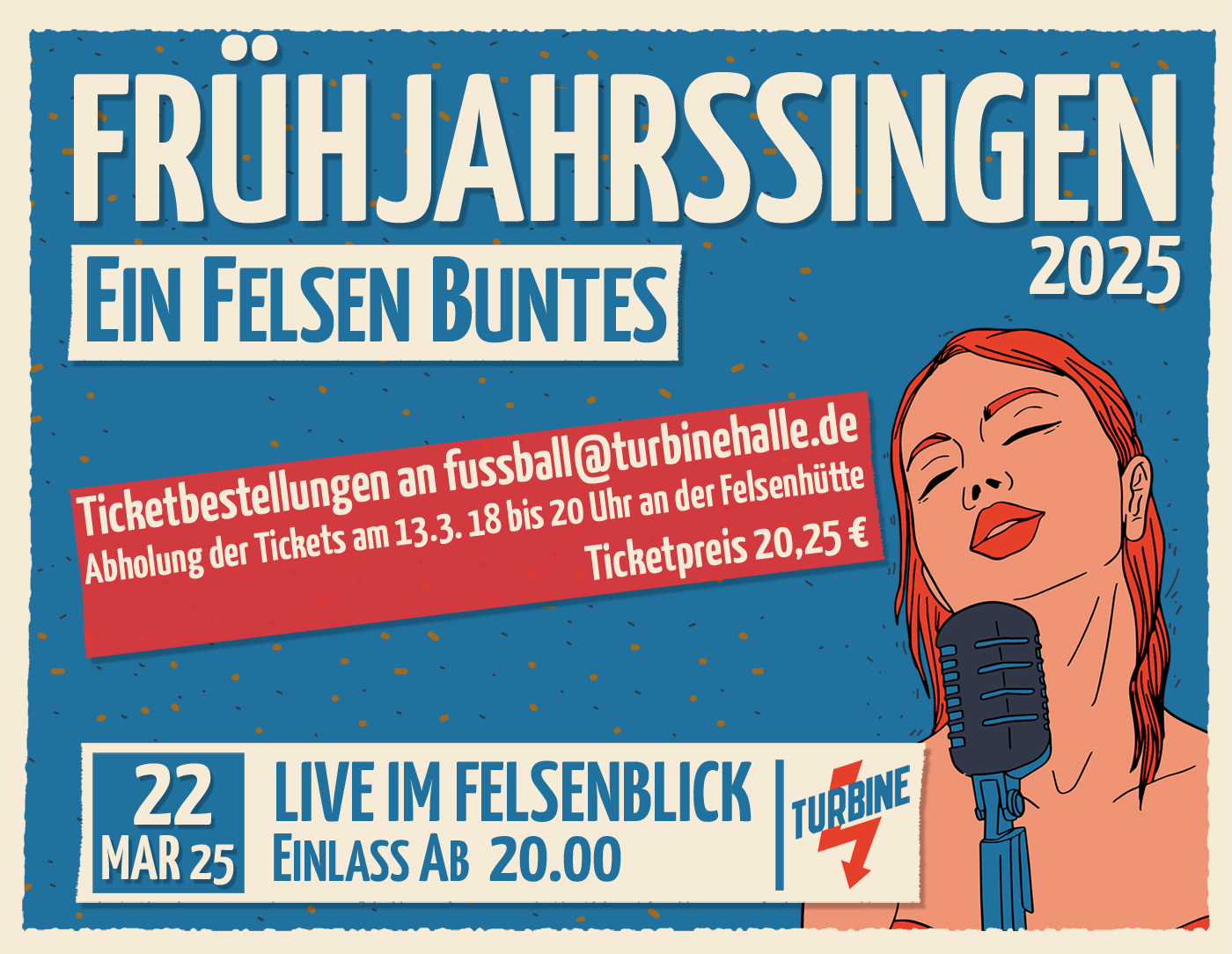 Am 22. März steigt im Felsenblick das dritte Frühjahrssingen und somit die insgesamt 4.Auflage der Turbine-Gesangsveranstaltung. Unter dem Motto "Ein Felsen Buntes" freuen wir uns auf ein buntes Programm und eine phänomenale Veranstaltung auf und vor der Bühne. Alle Künstler sind "verpflichtet" und wir verraten nicht zu viel, wenn wir behaupten, dass einige bekannte Gesichter aus der Turbinefamilie den Weg auf die Bühne wagen werden.