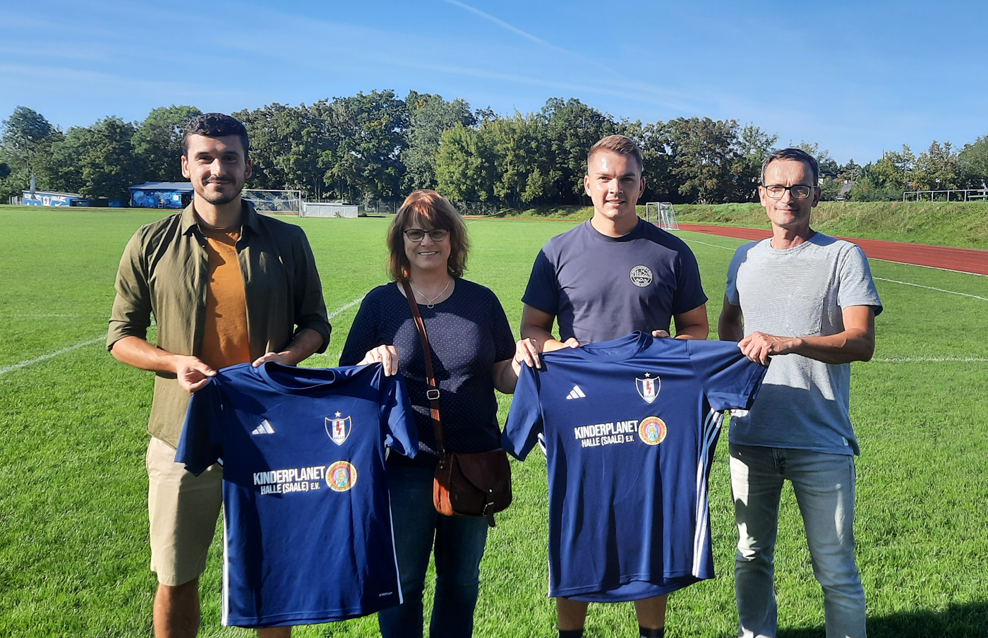 Trikotwerbung für einen sehr guten Zweck! Wir freuen uns, dass unser Landesligateam seine Brust für den Kinderplanet Halle e.V. zur Verfügung stellen und somit auf die wertvolle und wichtige Arbeit des Vereins zur Förderung krebskranker Kinder e.V. aufmerksam machen kann. Unsere Spieler Elias Kindl und Johann Kowalewicz präsentierten gemeinsam mit Gabriele Arndt vom Kinderplaneten die neuen Trikots.
